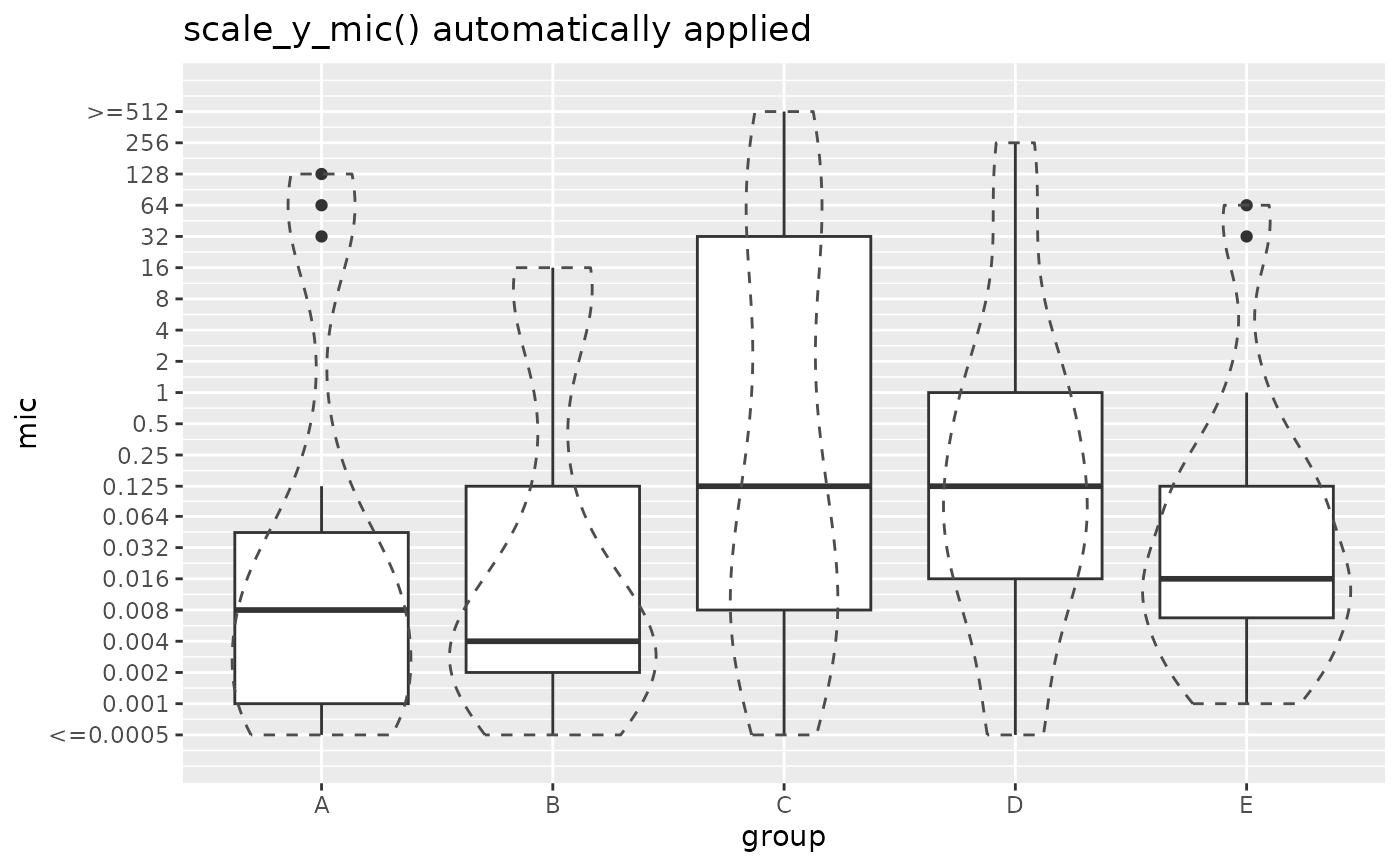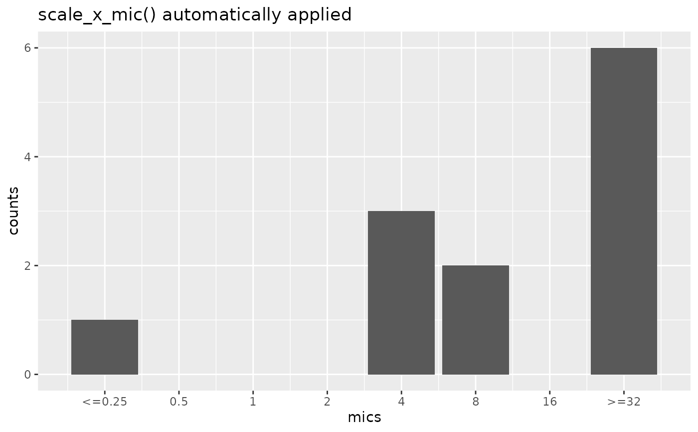 The functions scale_x_mic(), scale_y_mic(), scale_colour_mic(), and scale_fill_mic() functions allow to plot the mic class (MIC values) on a continuous, logarithmic scale.