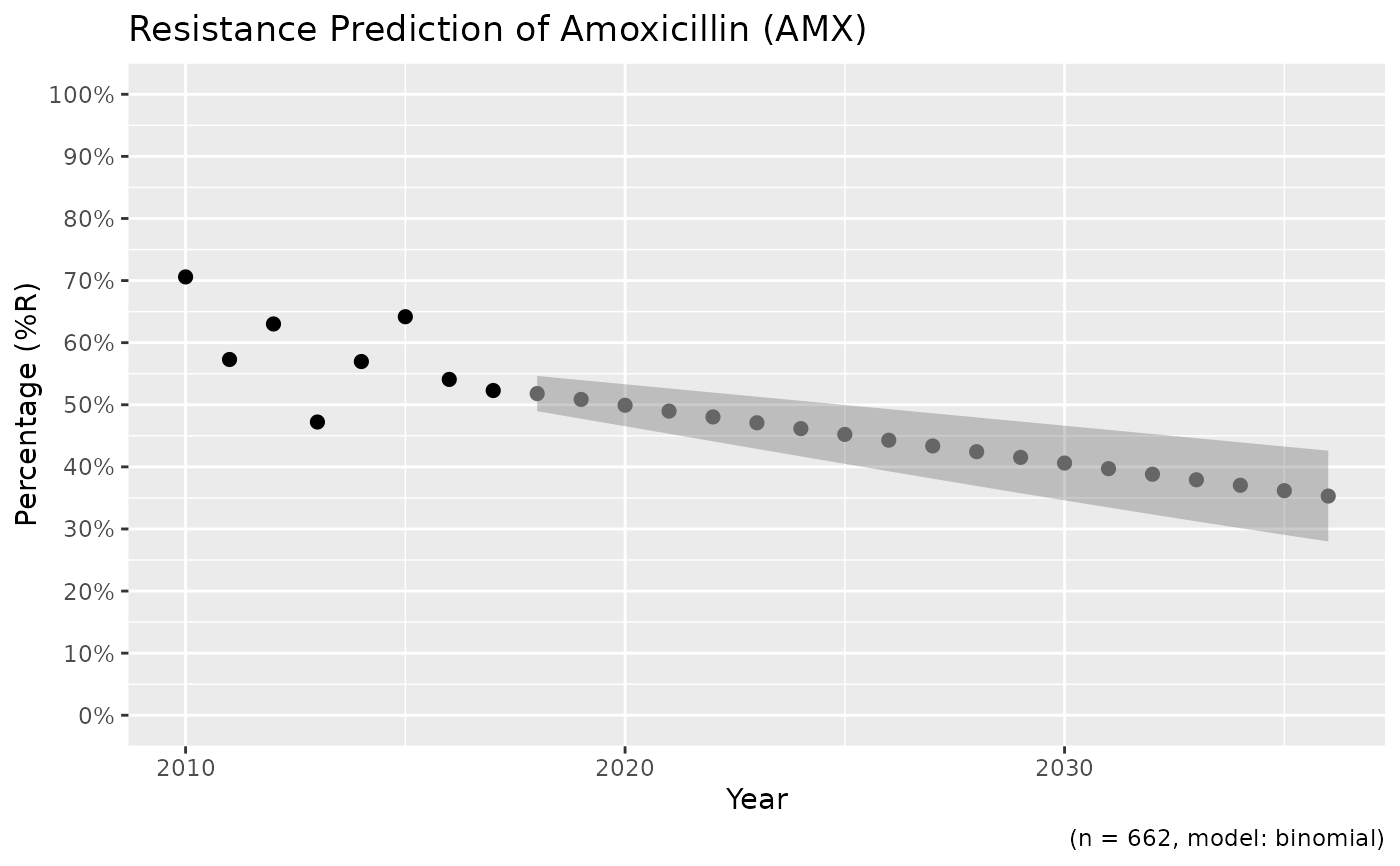Create a prediction model to predict antimicrobial resistance for the next years. Standard errors (SE) will be returned as columns se_min and se_max. See Examples for a real live example.
