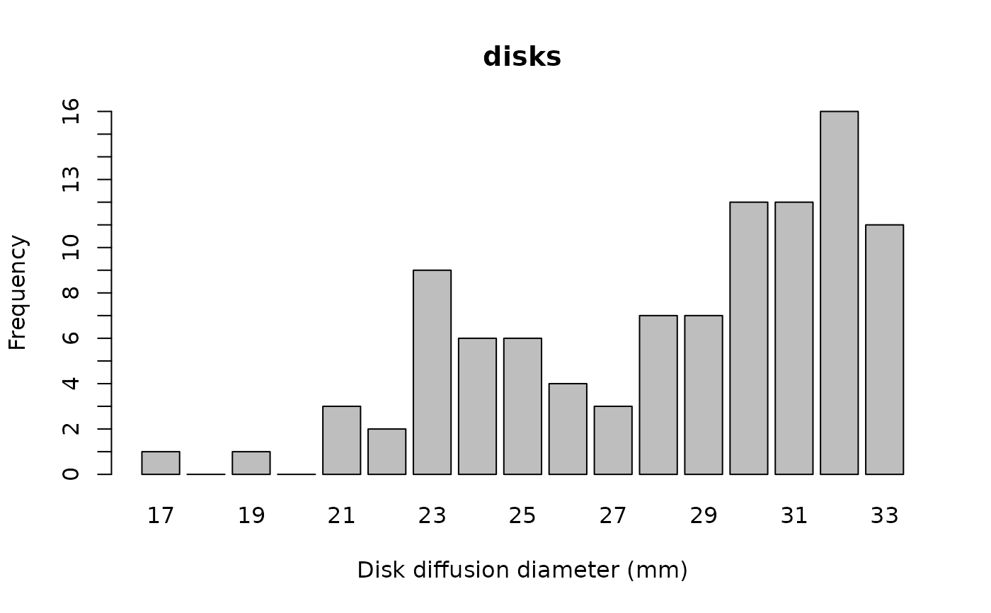 disks <- random_disk(100, severity = 2, mo = "Escherichia coli", ab = "CIP")