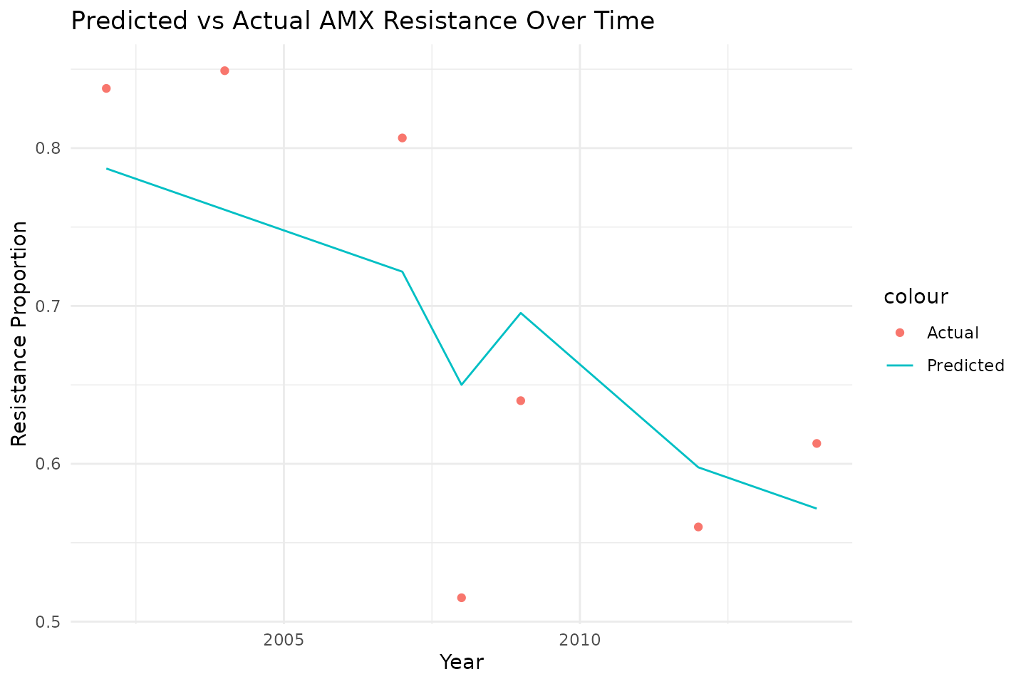labs(title = "Predicted vs Actual AMX Resistance Over Time",