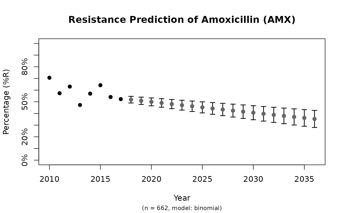 Create a prediction model to predict antimicrobial resistance for the next years. Standard errors (SE) will be returned as columns se_min and se_max. See Examples for a real live example.